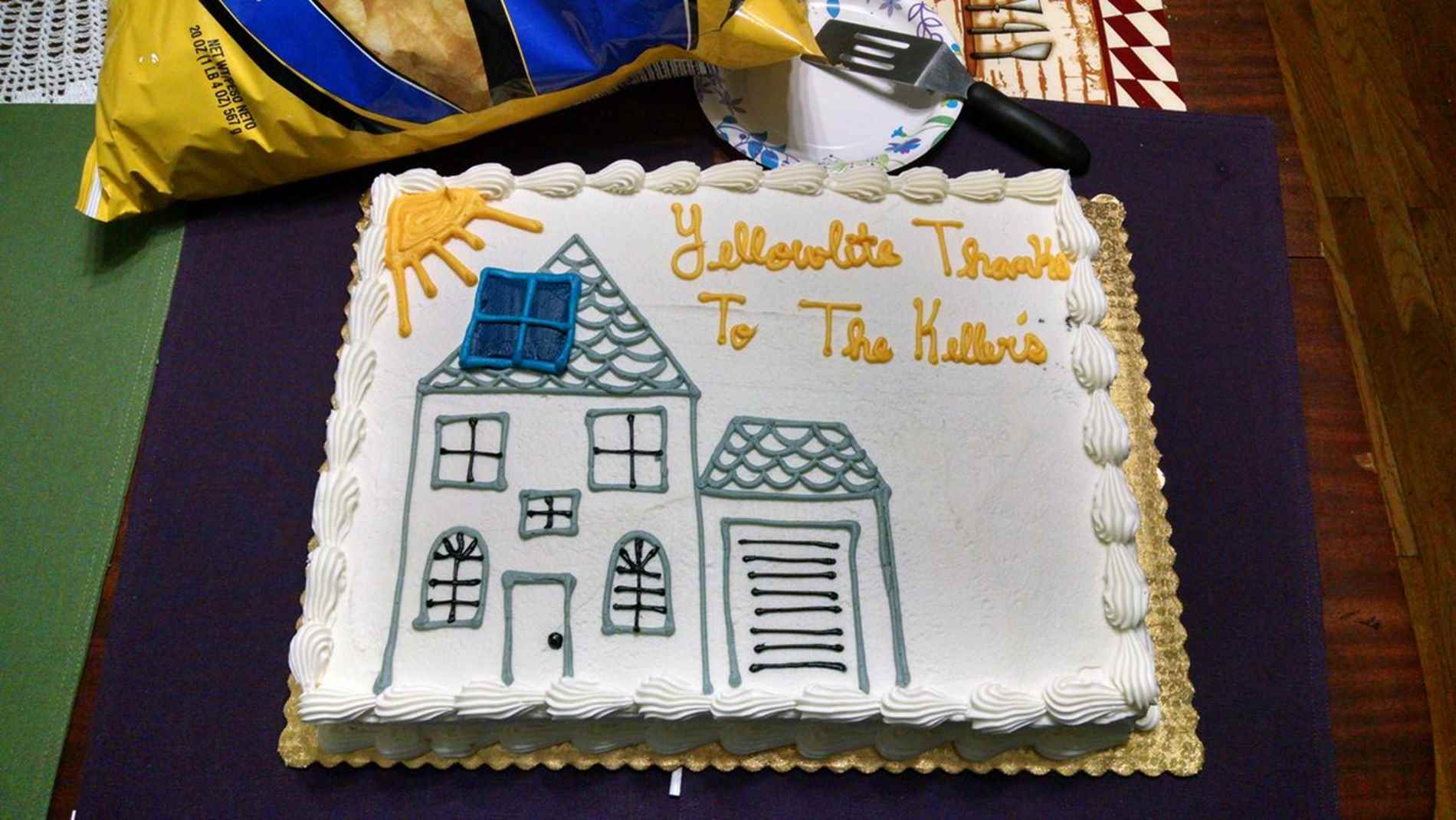 The Kellers were gracious hosts and enjoyed learning more about their solar energy system and sharing the experience with their loved ones. They especially appreciated the official YellowLite solar party cake that we bring to all our solar parties. The cake is chocolate, with a personalized note, and a frosting drawing of a house with solar panels.